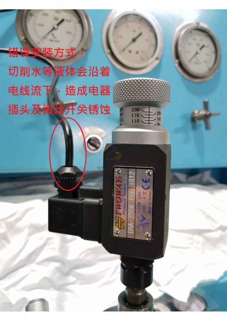 如圖為臺(tái)肯壓力開(kāi)關(guān)錯(cuò)誤的安裝方式,切削水等液體會(huì)沿著電線(xiàn)流下,造成電器插頭及微動(dòng)開(kāi)關(guān)銹蝕.