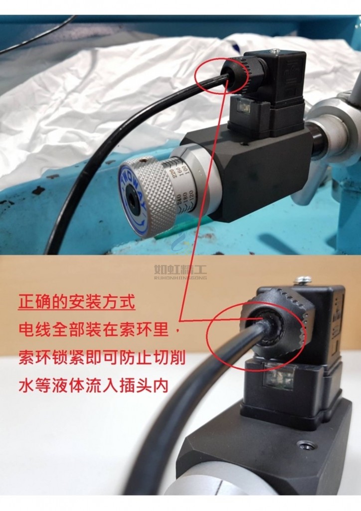 TWOWAY壓力開(kāi)關(guān)正確的安裝方式:電線(xiàn)全部裝在鎖環(huán)里,鎖環(huán)鎖緊即可防止切削水等液體流入插頭內(nèi).
