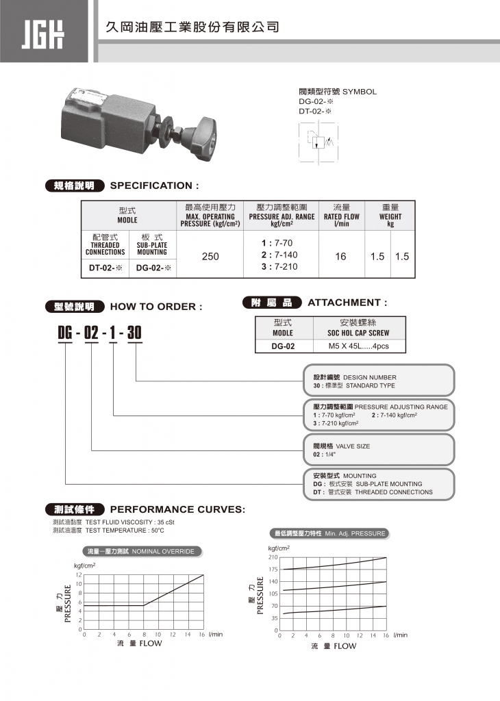 規(guī)格說(shuō)明 型式 最高使用壓力 kgf/cm2 壓力調(diào)整範(fàn)圍 kgf/cm2 流量 l/min 重量 kg 配管式 板式 250 1 :?7-70 2 :?7-140 3 :?7-210 16 1.5 1.5 DT-02- ※ DG-02- ※ JGH直動(dòng)式溢流閥常規(guī)型號(hào)參考:DG-02-1 , DG-02-2 , DG-02-3 , DT-02-1 , DT-02-2 , DT-02-3