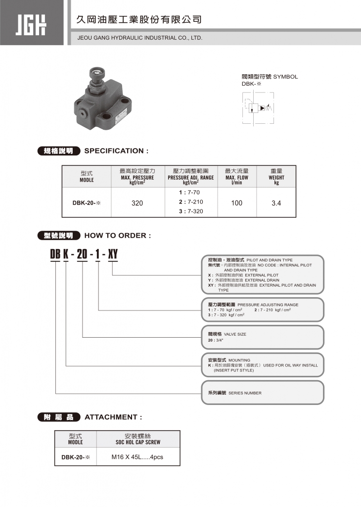 規(guī)格說明 型式 最高使用壓力 kgf/cm?2 壓力調整範圍 kgf/cm2 最大流量 l/min 重量 kg DBK-20-※ 320 1 :?7-70 2 :?7-210 3 :?7-320 100 3.4 JGH先導式溢流閥、電磁控制溢流閥常規(guī)型號參考:DBK-20-3 , DBK-20-2 , DBK-20-1