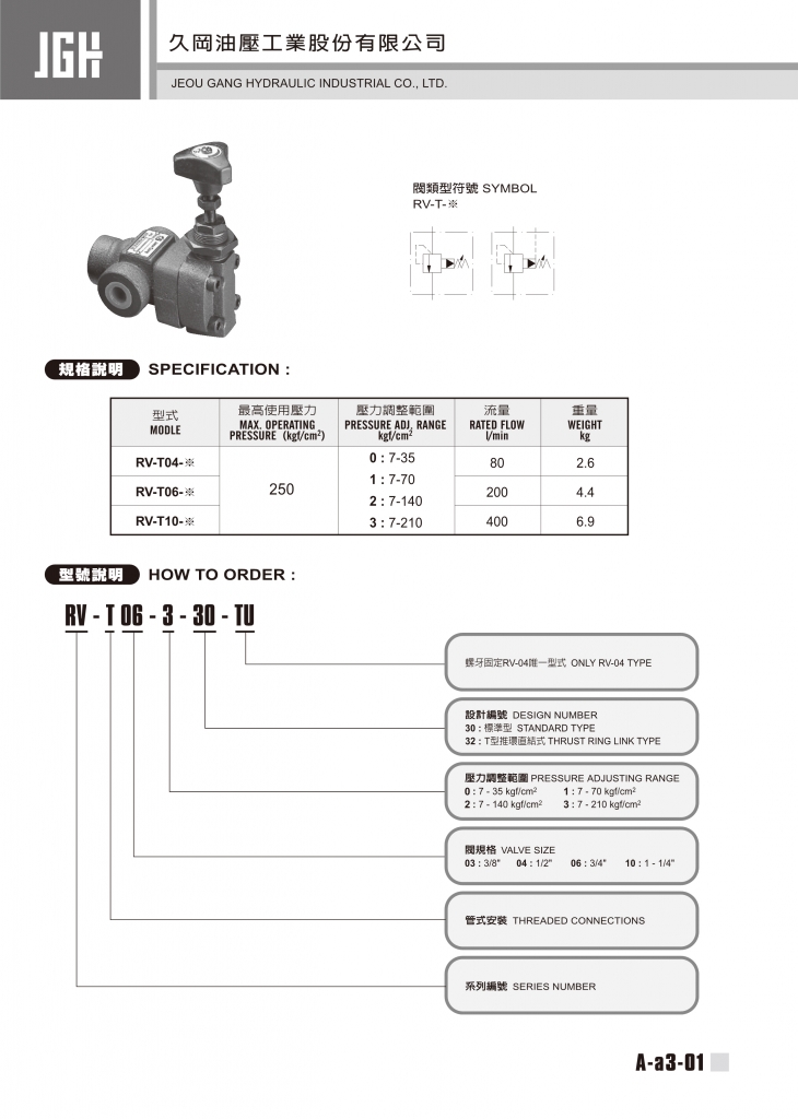JGH先導(dǎo)式溢流閥常規(guī)型號(hào)參考:RV-T03-1,RV-T03-2,RV-T03-3,RV-T04-1,RV-T04-2,RV-T04-3,RV-T06-1,RV-T06-2,RV-T06-3,RV-T10-1,RV-T10-2,RV-T10-3
