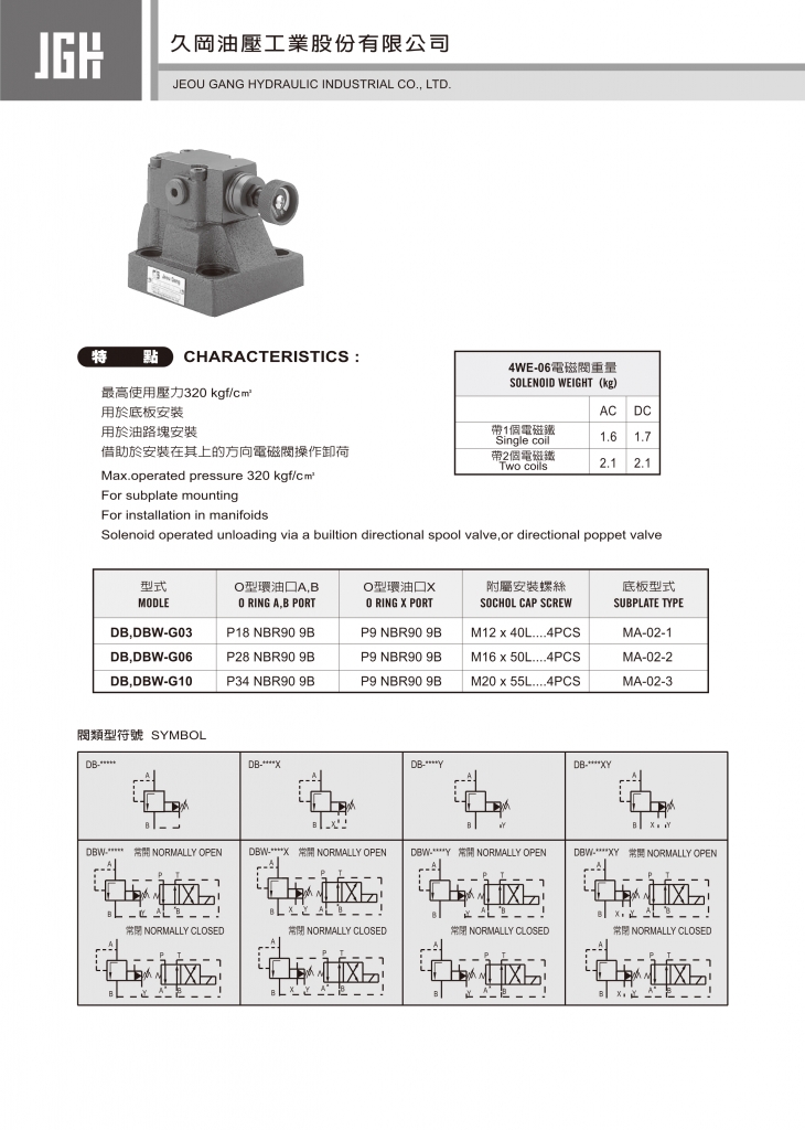 JGH電磁控制溢流閥常規(guī)型號參考:DB-G03-A-1 , DB-G03-A-2 , DB-G03-A-3 , DB-G03-B-1 , DB-G03-B-2 , DB-G03-B-3 , DB-G03-E-1 , DB-G03-E-2 , DB-G03-E-3 , DB-G06-A-1 , DB-G06-A-2 , DB-G06-A-3 , DB-G06-B-1 , DB-G06-B-2 , DB-G06-B-3 , DB-G06-E-1 , DB-G06-E-2 , DB-G06-E-3 , DB-G10-A-1 , DB-G10-A-2 , DB-G10-A-3 , DB-G10-B-1 , DB-G10-B-2 , DB-G10-B-3 , DB-G10-E-1 , DB-G10-E-2 , DB-G10-E-3 , DBW-G03-A-1 , DBW-G03-A-2 , DBW-G03-A-3 , DBW-G03-B-1 , DBW-G03-B-2 , DBW-G03-B-3 , DBW-G03-E-1 , DBW-G03-E-2 , DBW-G03-E-3 , DBW-G06-A-1 , DBW-G06-A-2 , DBW-G06-A-3 , DBW-G06-B-1 , DBW-G06-B-2 , DBW-G06-B-3 , DBW-G06-E-1 , DBW-G06-E-2 , DBW-G06-E-3 , DBW-G10-A-1 , DBW-G10-A-2 , DBW-G10-A-3 , DBW-G10-B-1 , DBW-G10-B-2 , DBW-G10-B-3 , DBW-G10-E-1 , DBW-G10-E-2 , DBW-G10-E-3