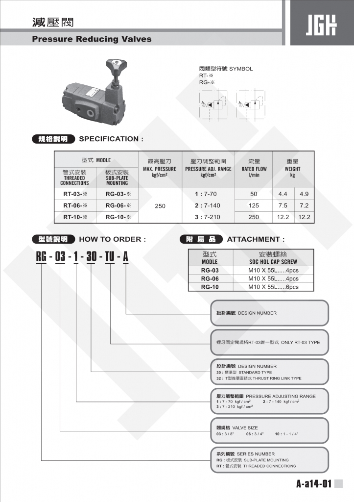 規(guī)格說明 型式 最高壓力 kgf/cm2 壓力調(diào)整範圍 kgf/cm2 流量 l/min 重量 kg 管式安裝 板式 RT-03-※ RG-03-※ 250 1 :?7-70 2 :?7-140 3 :?7-210 50 4.4 4.9 RT-06-※ RG-06-※ 125 7.5 7.2 RT-10-※ RG-10-※ 250 12.2 12.2 JGH減壓閥常規(guī)型號參考:RG-03-1 ,