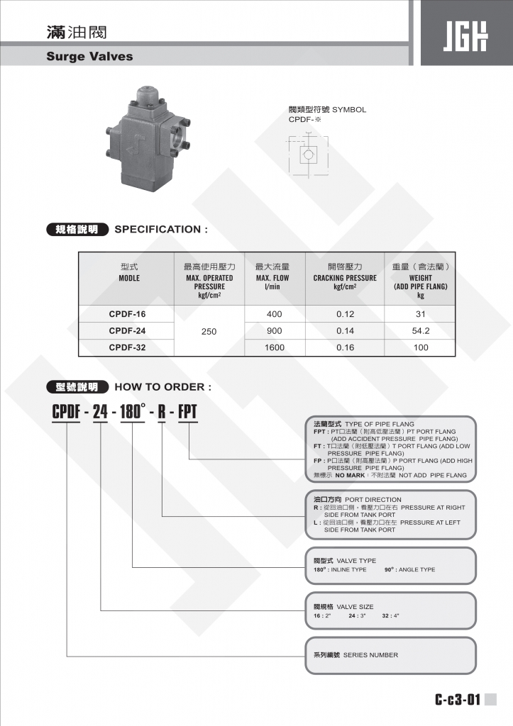 規(guī)格說明 型式 最高使用壓力 kgf/cm?2 開啟壓力 kgf/cm?2 流量 l/min 重量(含法蘭) kg CPDF-16 250 400 0.12 31 CPDF-24 900 0.14 54.2 CPDF-32 1600 0.16 100 JGH滿油閥常規(guī)型號參考:CPDF-16-180-L , CPDF-16-180-L-FP , CPDF-16-180-L-FPT , CPDF-1