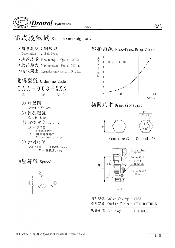 DTL插式梭動閥常規(guī)型號參考:CAA-063-XXN , CAA-063-XVN , CAA-063-XXV , CAA-063-XVV