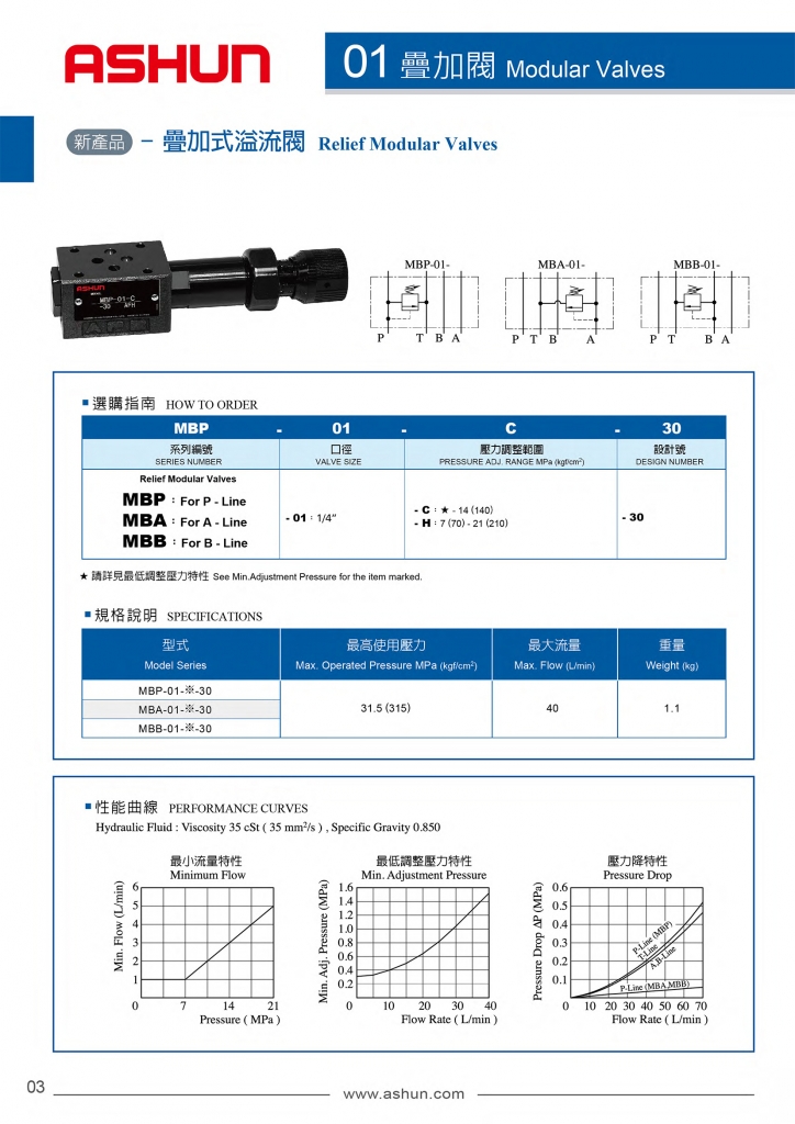 MBP,MBA,MBB系列疊加式溢流閥常規(guī)型號參考:MBB-01-H-30 , MBA-01-H-30 , MBP-01-H-30 , MBB-01-C-30 , MBA-01-C-30 , MBP-01-C-30