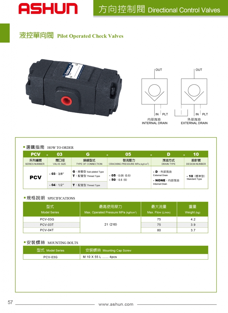 ASHUN液控單向閥常規(guī)型號(hào)參考:PCV-03G-05-10 , PCV-03G-05-D-10 , PCV-03G-50-10 , PCV-03G-50-D-10 , PCV-03T-05-10 , PCV-03T-05-D-10 , PCV-03T-50-10 , PCV-03T-50-D-10 , PCV-04T-05-10 , PCV-04T-05-D-10 , PCV-04T-50-10 , PCV-04T-50-D-10