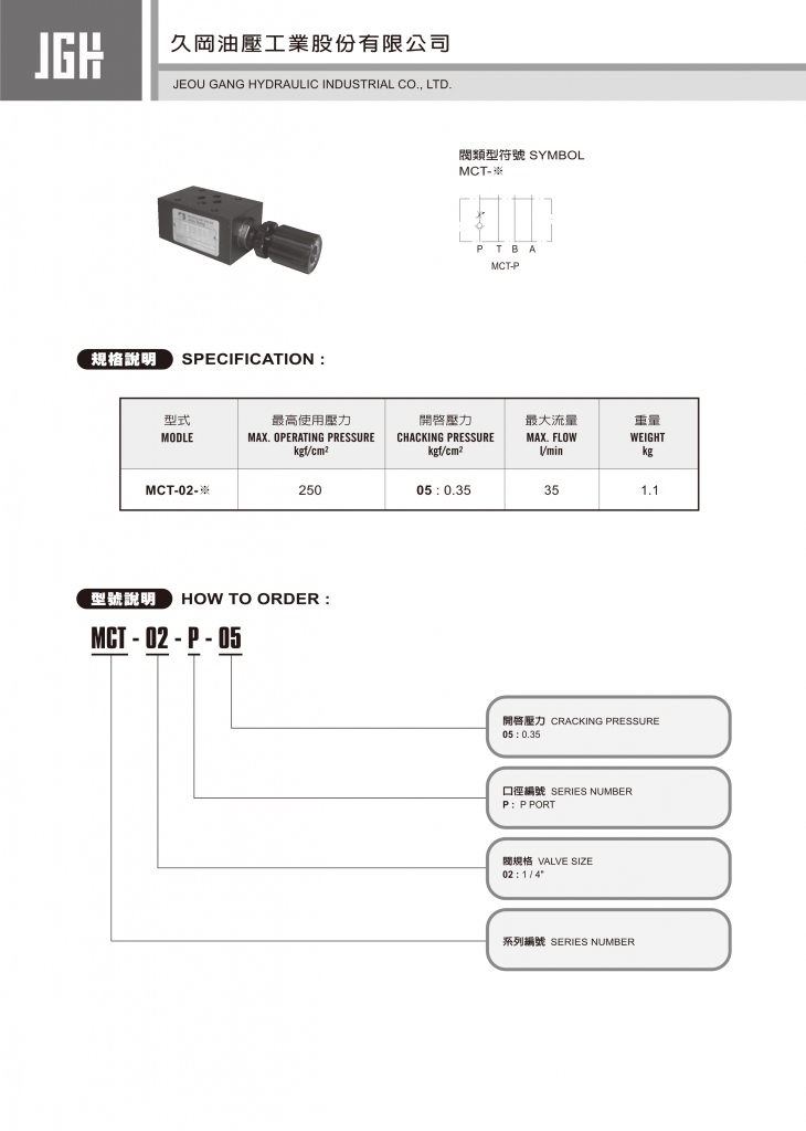 JGH疊加式止逆節(jié)流閥部分常規(guī)型號參考:MCT-02-P-05