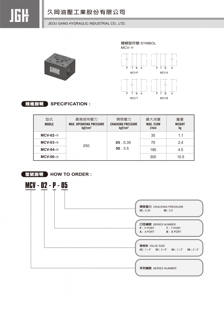 JGH疊加式單向閥部分常規(guī)型號參考:MCV-02-A-05 , MCV-02-A-50 , MCV-02-B-05 , MCV-02-B-50 , MCV-02-P-05 , MCV-02-P-50 , MCV-02-T-05 , MCV-02-T-50 , MCV-03-A-05 , MCV-03-A-50 , MCV-03-B-05 , MCV-03-B-50 , MCV-03-P-05 , MCV-03-P-50 , MCV-03-T-05 , MCV-03-T-50 , MCV-04-A-05 , MCV-04-A-50 , MCV-04-B-05 , MCV-04-B-50 , MCV-04-P-05 , MCV-04-P-50 , MCV-04-T-05 , MCV-04-T-50 , MCV-06-A-05 , MCV-06-A-50 , MCV-06-B-05 , MCV-06-B-50 , MCV-06-P-05 , MCV-06-P-50 , MCV-06-T-05 , MCV-06-T-50