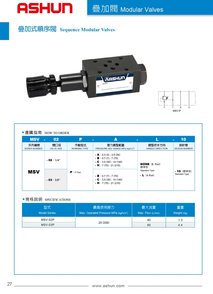 ASHUN疊加式順序閥常規(guī)型號參考:MSV-02P-A-10 , MSV-02P-A-L-10 , MSV-02P-B-10 , MSV-02P-B-L-10 , MSV-02P-C-10 , MSV-02P-C-L-10 , MSV-02P-H-10 , MSV-02P-H-L-10 , MSV-03P-B-10 , MSV-03P-B-L-10 , MSV-03P-C-10 , MSV-03P-C-L-10 , MSV-03P-H-10 , MSV-03P-H-L-10