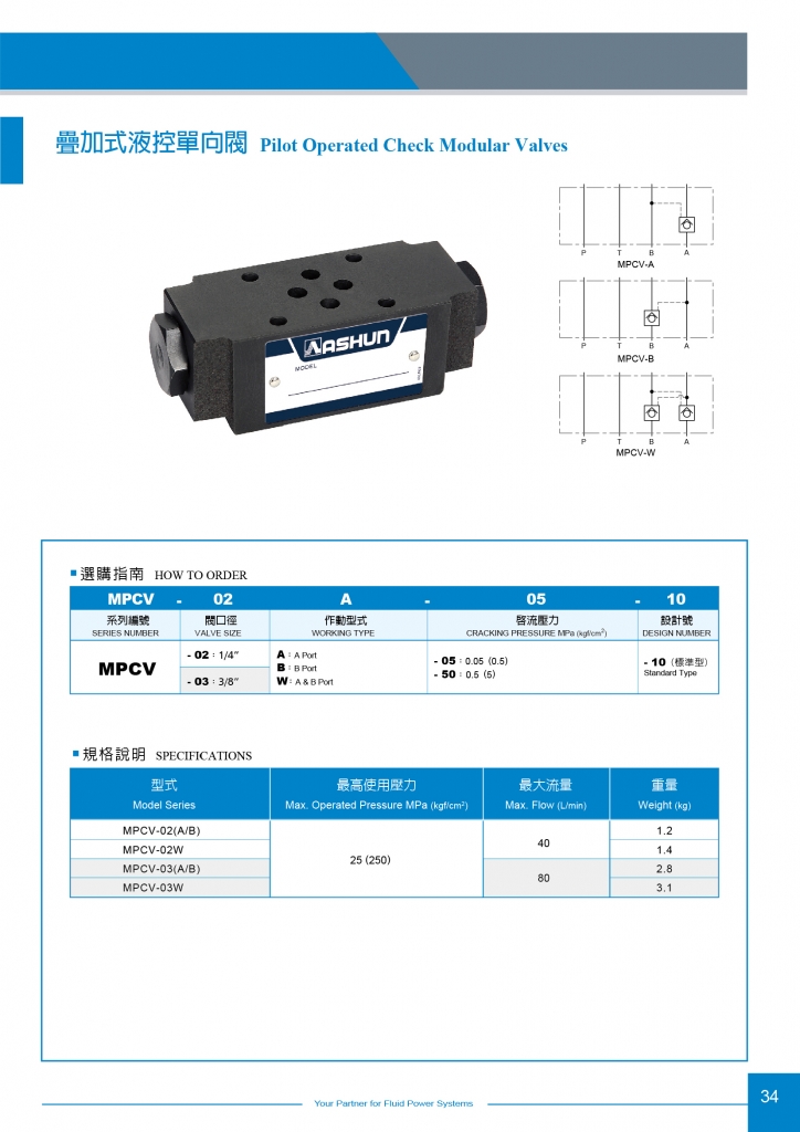 ASHUN疊加式液控單向閥常規(guī)型號參考:MPCV-02A-05-10 , MPCV-02A-50-10 , MPCV-02B-05-10 , MPCV-02B-50-10 , MPCV-02W-05-10 , MPCV-02W-50-10 , MPCV-03A-05-10 , MPCV-03A-50-10 , MPCV-03B-05-10 , MPCV-03B-50-10 , MPCV-03W-05-10 , MPCV-03W-50-10