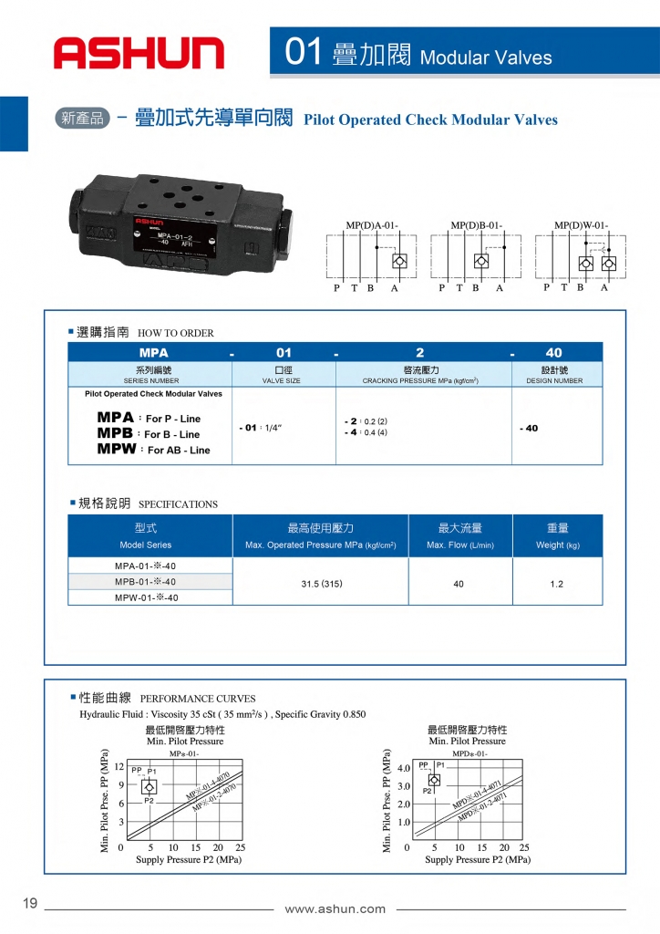 ASHUN疊加式先導單向閥常規(guī)型號參考:MPA-01-2-40 , MPA-01-4-40 , MPB-01-2-40 , MPB-01-4-40 , MPW-01-2-40 , MPW-01-4-40