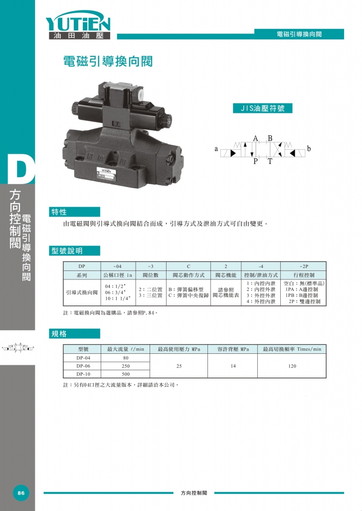YUTIEN電磁引導(dǎo)換向閥部分常規(guī)型號(hào)參考:DP-04-2B12A-1-2P , DP-04-2B12A-2-2P , DP-04-2B12A-3-2P , DP-04-2B12A-4-2P , DP-04-2B2-1-2P , DP-04-2B2-2-2P , DP-04-2B2-3-2P , DP-04-2B2-4-2P , DP-04-2B2B-1-2P , DP-04-2B2B-2-2P , DP-04-2B2B-3-2P , DP-04-2B2B-4-2P , DP-04-3C12-1-2P , DP-04-3C12-2-2P , DP-04-3C12-3-2P , DP-04-3C12-4-2P , DP-04-3C2-1-2P , DP-04-3C2-2-2P , DP-04-3C2-3-2P , DP-04-3C2-4-2P , DP-04-3C60-1-2P , DP-04-3C60-2-2P , DP-04-3C60-3-2P , DP-04-3C60-4-2P , DP-06-2B12A-1-2P , DP-06-2B12A-2-2P , DP-06-2B12A-3-2P , DP-06-2B12A-4-2P , DP-06-2B2-1-2P , DP-06-2B2-2-2P , DP-06-2B2-3-2P , DP-06-2B2-4-2P , DP-06-2B2B-1-2P , DP-06-2B2B-2-2P , DP-06-2B2B-3-2P , DP-06-2B2B-4-2P , DP-06-3C12-1-2P , DP-06-3C12-2-2P , DP-06-3C12-3-2P , DP-06-3C12-4-2P , DP-06-3C2-1-2P , DP-06-3C2-2-2P , DP-06-3C2-3-2P , DP-06-3C2-4-2P , DP-06-3C60-1-2P , DP-06-3C60-2-2P , DP-06-3C60-3-2P , DP-06-3C60-4-2P , DP-10-2B12A-1-2P , DP-10-2B12A-2-2P , DP-10-2B12A-3-2P , DP-10-2B12A-4-2P , DP-10-2B2-1-2P , DP-10-2B2-2-2P , DP-10-2B2-3-2P , DP-10-2B2-4-2P , DP-10-2B2B-1-2P , DP-10-2B2B-2-2P , DP-10-2B2B-3-2P , DP-10-2B2B-4-2P , DP-10-3C12-1-2P , DP-10-3C12-2-2P , DP-10-3C12-3-2P , DP-10-3C12-4-2P , DP-10-3C2-1-2P , DP-10-3C2-2-2P , DP-10-3C2-3-2P , DP-10-3C2-4-2P , DP-10-3C60-1-2P , DP-10-3C60-2-2P , DP-10-3C60-3-2P , DP-10-3C60-4-2P