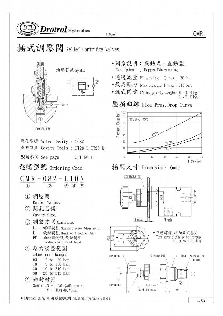 DTL插式調(diào)壓閥部分常規(guī)型號參考:CMR-082-K03N , CMR-082-K03V , CMR-082-K10N , CMR-082-K10V , CMR-082-K20N , CMR-082-K20V , CMR-082-K30N , CMR-082-K30V , CMR-082-L03N , CMR-082-L03V , CMR-082-L10N , CMR-082-L10V , CMR-082-L20N , CMR-082-L20V , CMR-082-L30N , CMR-082-L30V , CMR-082-PK03N , CMR-082-PK03V , CMR-082-PK10N , CMR-082-PK10V , CMR-082-PK20N , CMR-082-PK20V , CMR-082-PK30N , CMR-082-PK30V ,