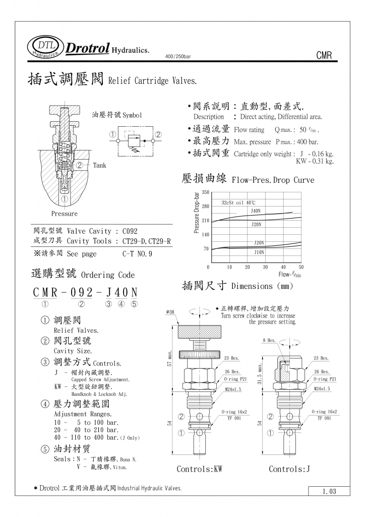 DTL插式調(diào)壓閥部分常規(guī)型號參考:CMR-092-J10N , CMR-092-J10V , CMR-092-J20N , CMR-092-J20V , CMR-092-J40N , CMR-092-J40V , CMR-092-KW10N , CMR-092-KW10V , CMR-092-KW20N , CMR-092-KW20V , CMR-092-KW40N , CMR-092-KW40V ,