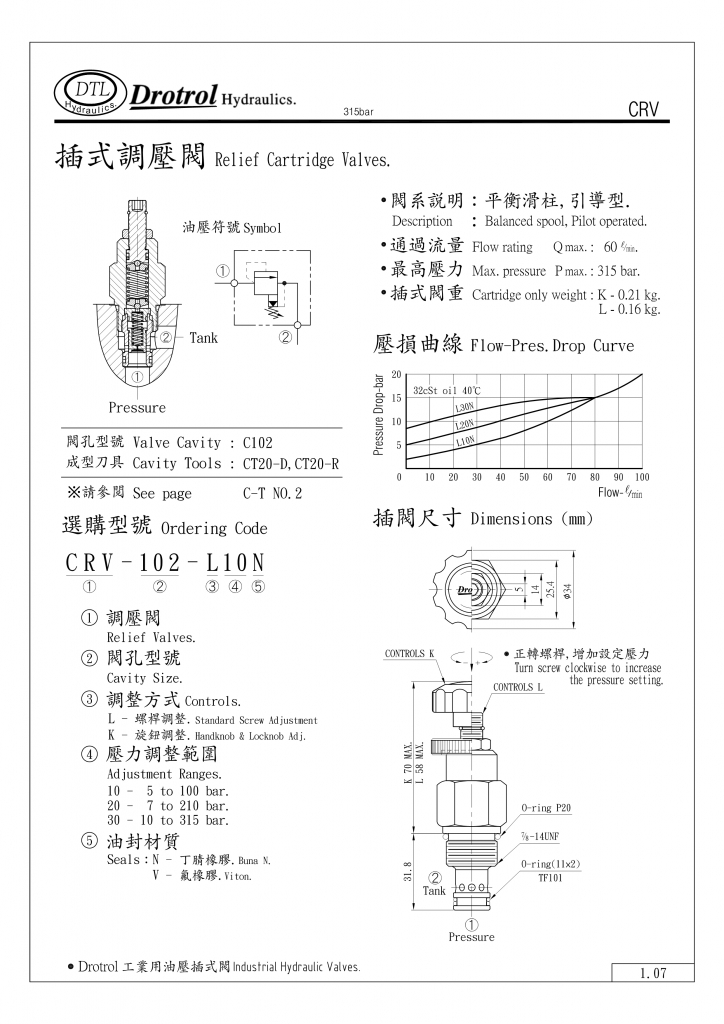 DTL插式調(diào)壓閥部分常規(guī)型號(hào)參考:CRV-102-K10N , CRV-102-K10V , CRV-102-K20N , CRV-102-K20V , CRV-102-K30N , CRV-102-K30V , CRV-102-L10N , CRV-102-L10V , CRV-102-L20N , CRV-102-L20V , CRV-102-L30N , CRV-102-L30V ,