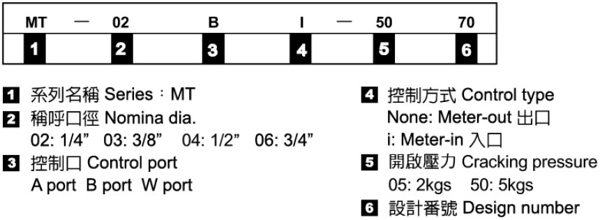 | 型式號碼 | 最大壓力 (KG/CM2) | 最大流量 (L/MIN) |