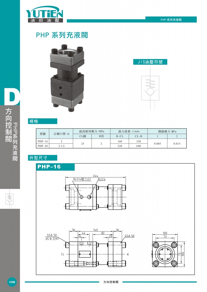 YUTIEN充液閥部分常規(guī)型號參考:PHP-16 , PHP-20