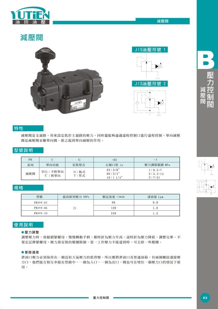 YUTIEN減壓閥部分常規(guī)型號(hào)參考:PRCG-03-1 , PRCG-03-2 , PRCG-03-3 , PRCG-06-1 , PRCG-06-2 , PRCG-06-3 , PRCG-10-1 , PRCG-10-2 , PRCG-10-3 , PRCT-03-1 , PRCT-03-2 , PRCT-03-3 , PRCT-06-1 , PRCT-06-2 , PRCT-06-3 , PRCT-10-1 , PRCT-10-2 , PRCT-10-3 , PRG-03-1 , PRG-03-2 , PRG-03-3 , PRG-06-1 , PRG-06-2 , PRG-06-3 , PRG-10-1 , PRG-10-2 , PRG-10-3 , PRT-03-1 , PRT-03-2 , PRT-03-3 , PRT-06-1 , PRT-06-2 , PRT-06-3 , PRT-10-1 , PRT-10-2 , PRT-10-3