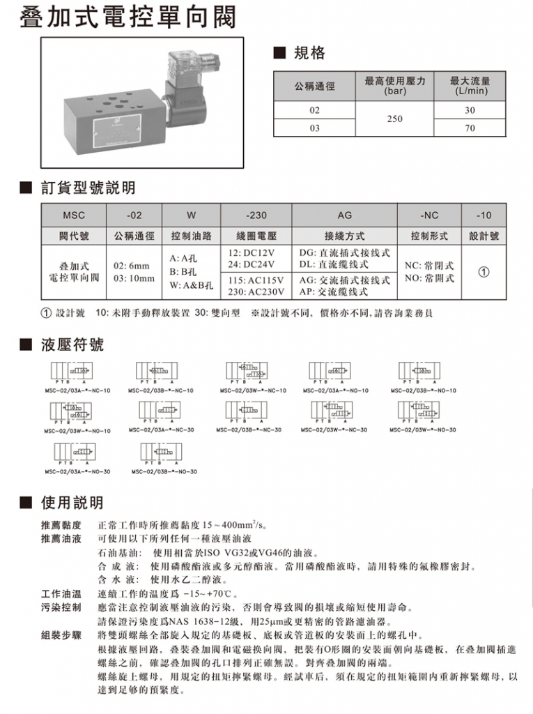 NORTHMAN疊加式電控單向閥部分常規(guī)型號(hào)參考:MSC-02A-115 , MSC-02A-12 , MSC-02A-230 , MSC-02A-24 , MSC-02B-115 , MSC-02B-12 , MSC-02B-230 , MSC-02B-24 , MSC-02W-115 , MSC-02W-12 , MSC-02W-230 , MSC-02W-24 , MSC-03A-115 ,