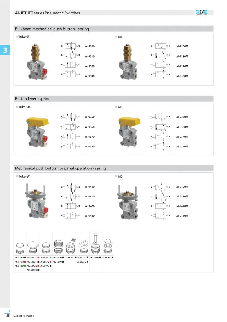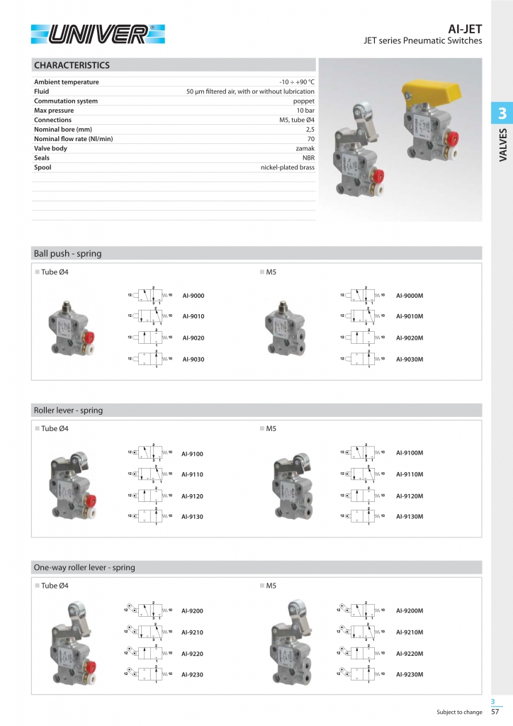 UNIVER JET pneumatic switches have been designed to meet the ever increasing need to save space without compromising on performance or reliability. Available in two port options, M5 threaded, or quick couplings ? (4 x 2) for quick assembly porposes.