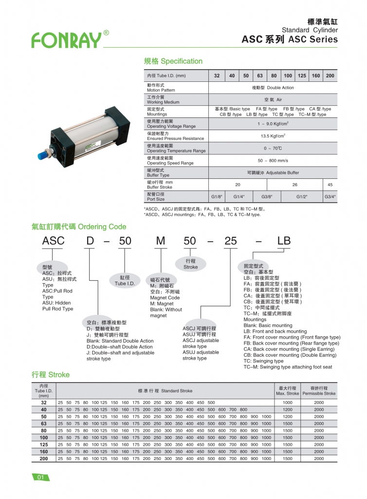 | ASC標準汽缸系列 | 32 40 50 63 80 100 125 160 200 |