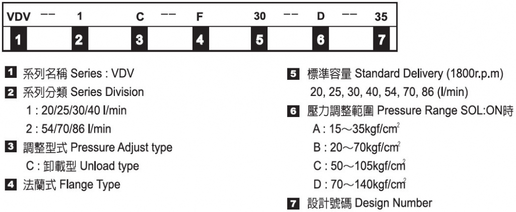 | VDV-1C-F(L)20-※35 | 20 | 15 ~ 18 | A: 15 ~ 35 kgf/cm2 B: 20 ~ 70 kgf/cm2 C: 50 ~ 105 kgf/cm2 D: 70 ~ 140 kgf/cm2 |