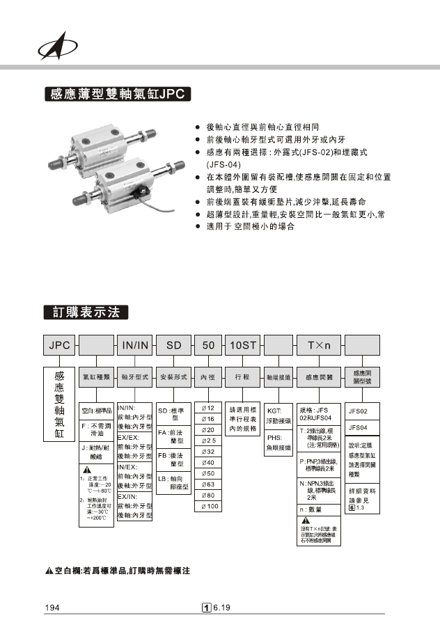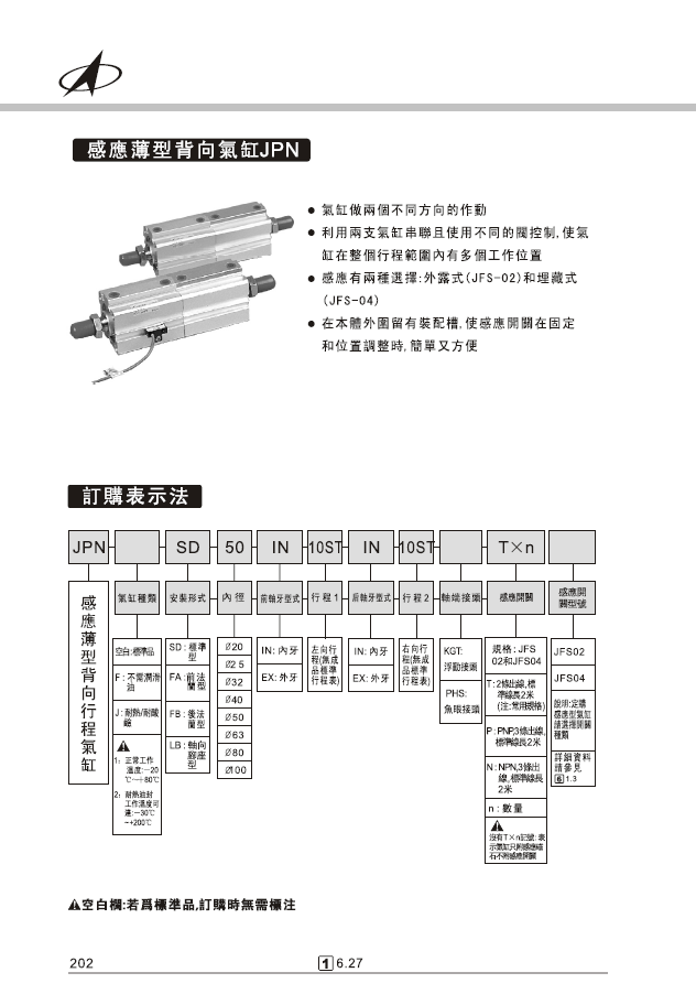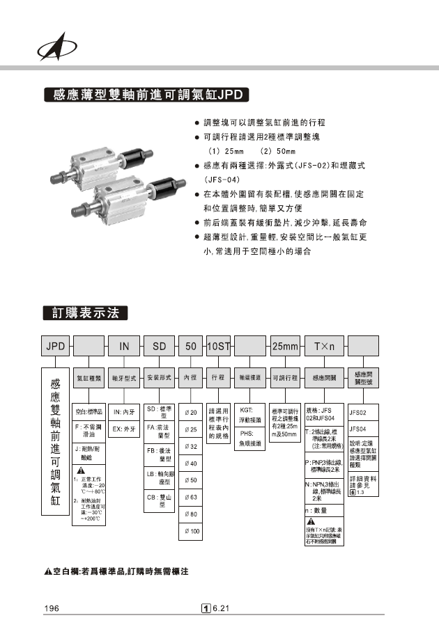 JPA感應(yīng)薄型復(fù)動(dòng)氣缸JPB感應(yīng)薄型單動(dòng)氣缸JPC感應(yīng)薄型雙軸氣缸JPD感應(yīng)薄型雙軸前進(jìn)可調(diào)氣缸JPL感應(yīng)薄型長(zhǎng)行程復(fù)動(dòng)氣缸JPM感應(yīng)薄型雙端行程氣缸JPN感應(yīng)薄型背向氣缸