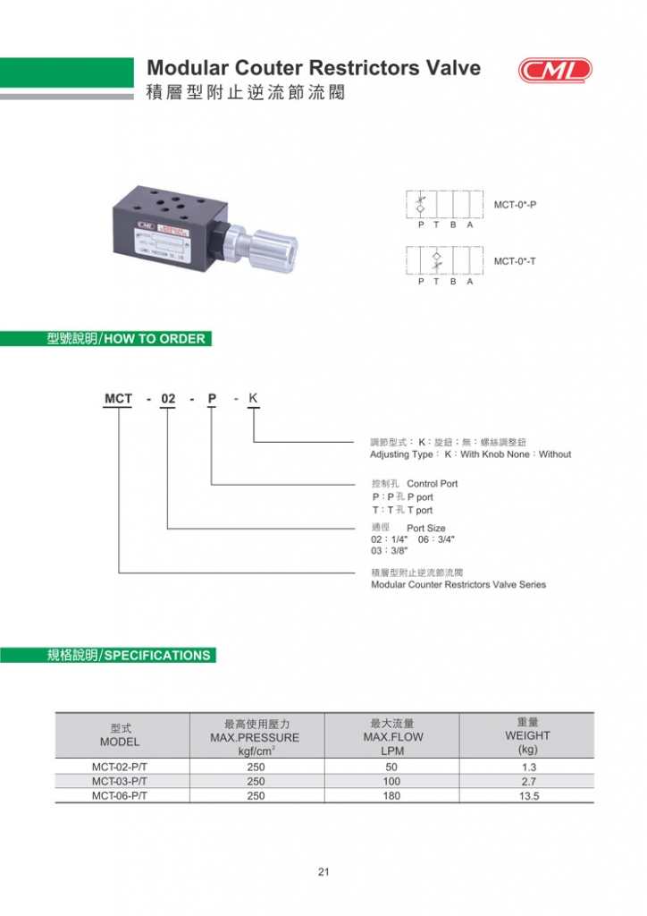 CML積層型附止逆流節(jié)流閥部分常規(guī)型號(hào)參考:MCT-02-P、MCT-02-T、MCT-03-P、MCT-03-T、MCT-06-P、MCT-06-T