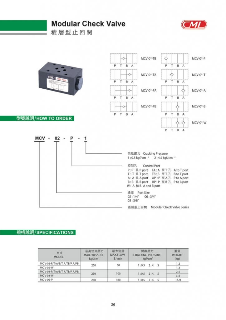 CML積層閥,積層止回閥MCV-02,MCV-03系列型號參考